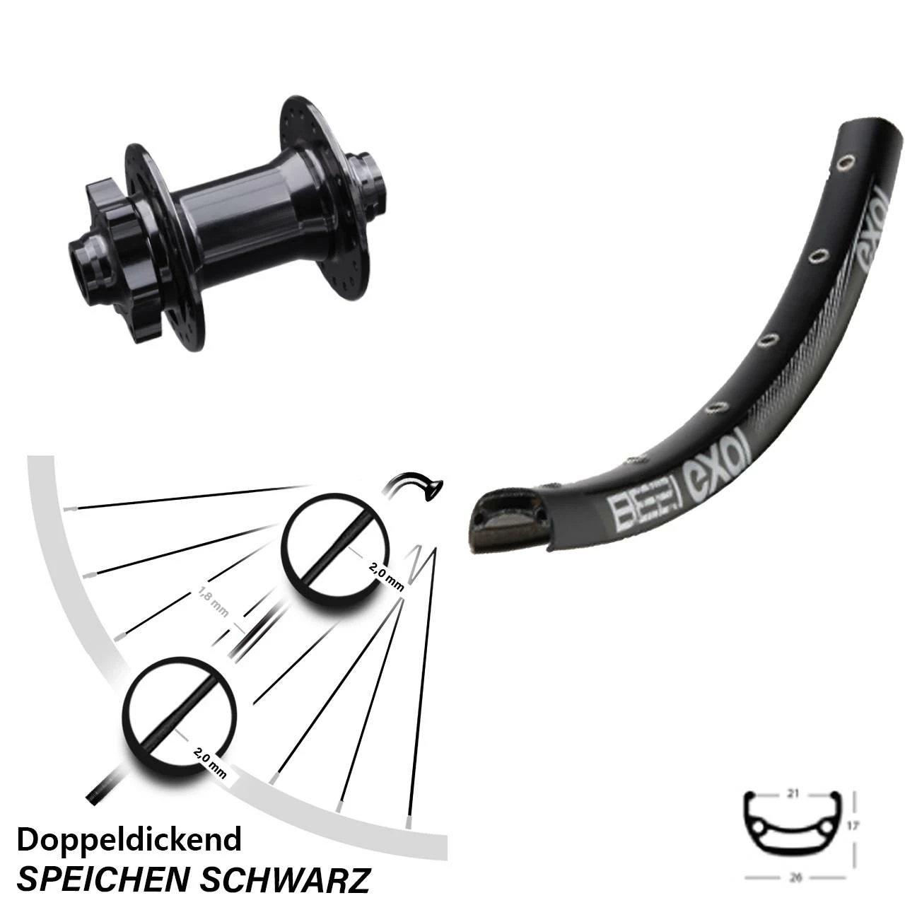 Technische Daten Vorderrad Exal BE 21 schwarz mit Nabe Formula DHDC-71 schwarz