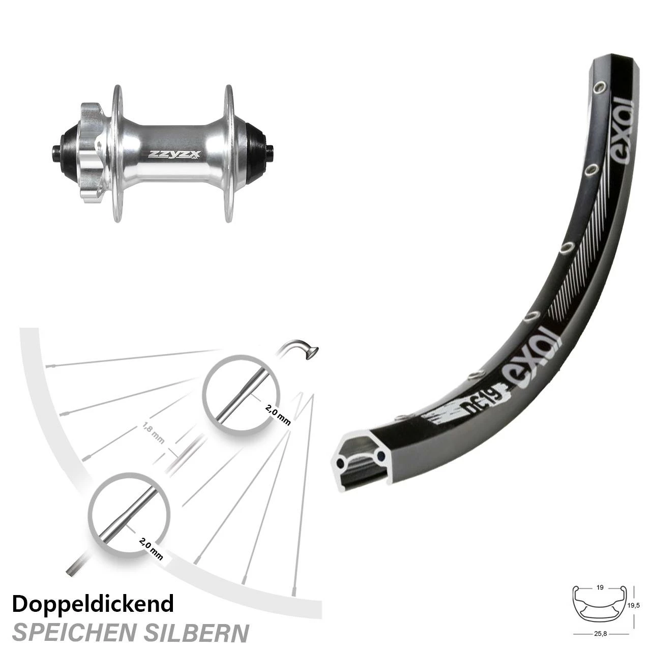 Technische Daten Vorderrad Exal DC 19 schwarz mit Nabe Formula ZZYZX DC-61 silbern