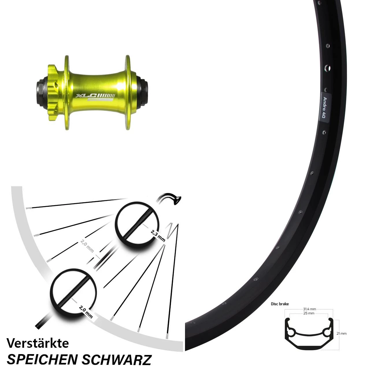 Technische Daten Vorderrad Ryde Andra 40 Disc schwarz mit Nabe XLC Evo VR Disc grün Steckachse