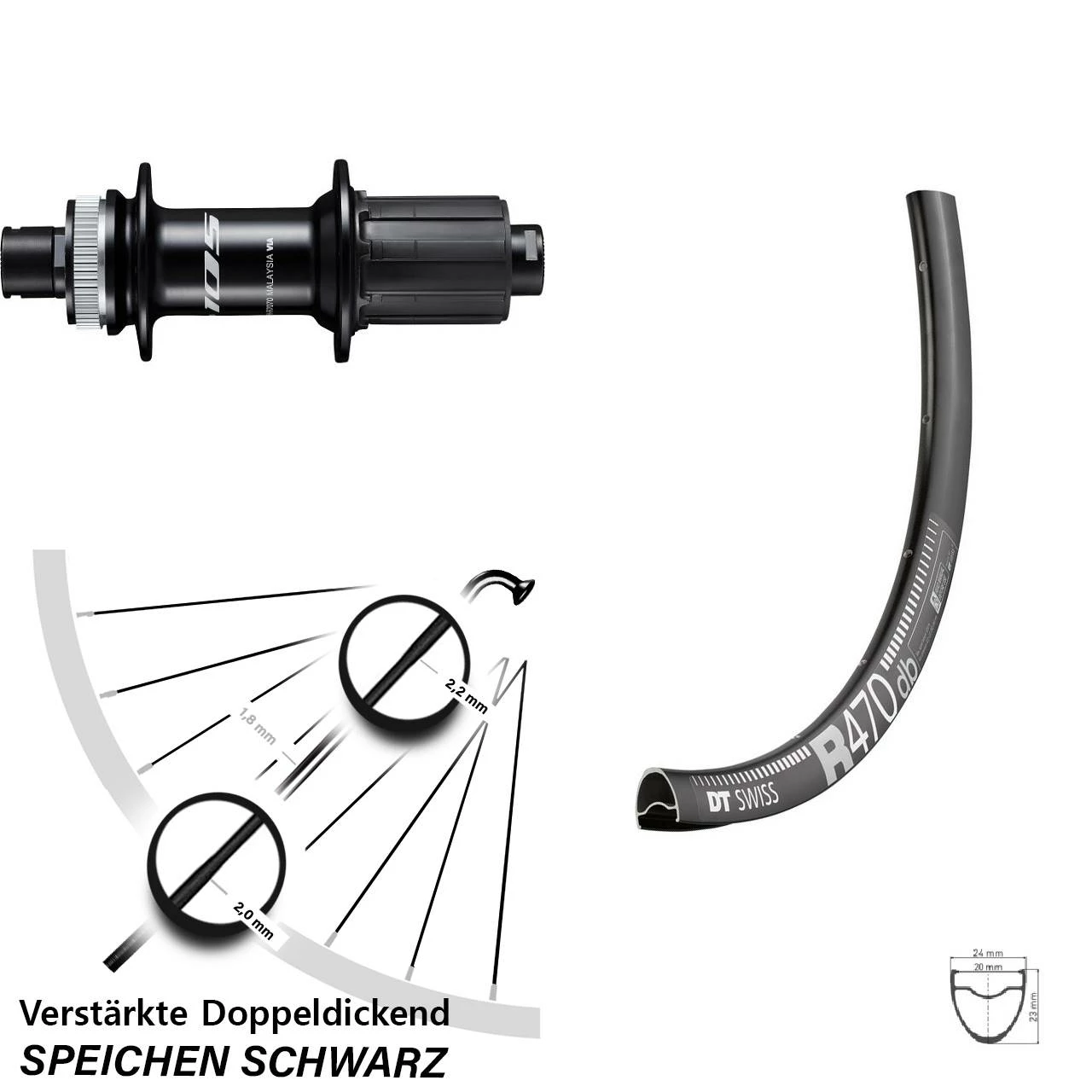 Technische Daten Hinterrad DT Swiss R 470 Disc schwarz und Nabe Shimano FH-R7070 schwarz