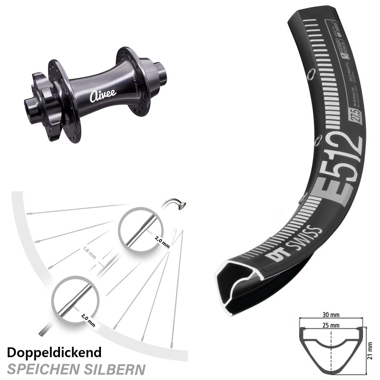 Technische Daten Vorderrad DT Swiss E 512 DB Disc schwarz mit Nabe Aivee Classic Boost 6-Loch vorne
