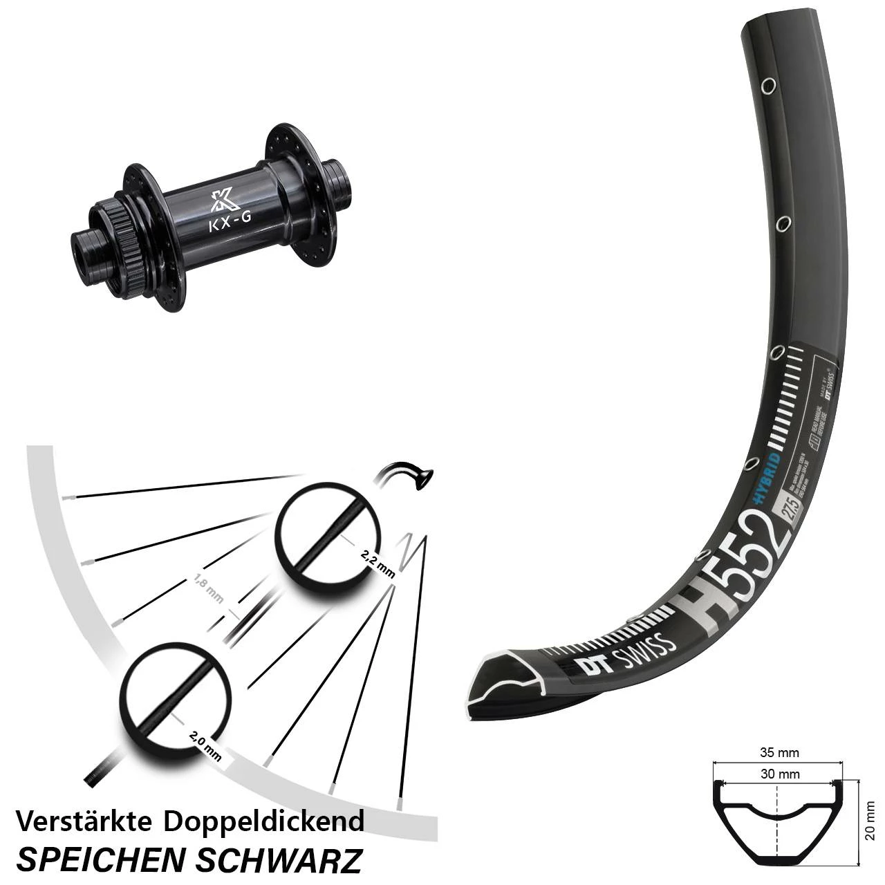 Technische Daten Vorderrad DT Swiss H 552 Disc schwarz mit Nabe KX-G Vorderradnabe 15/100 Centerlock