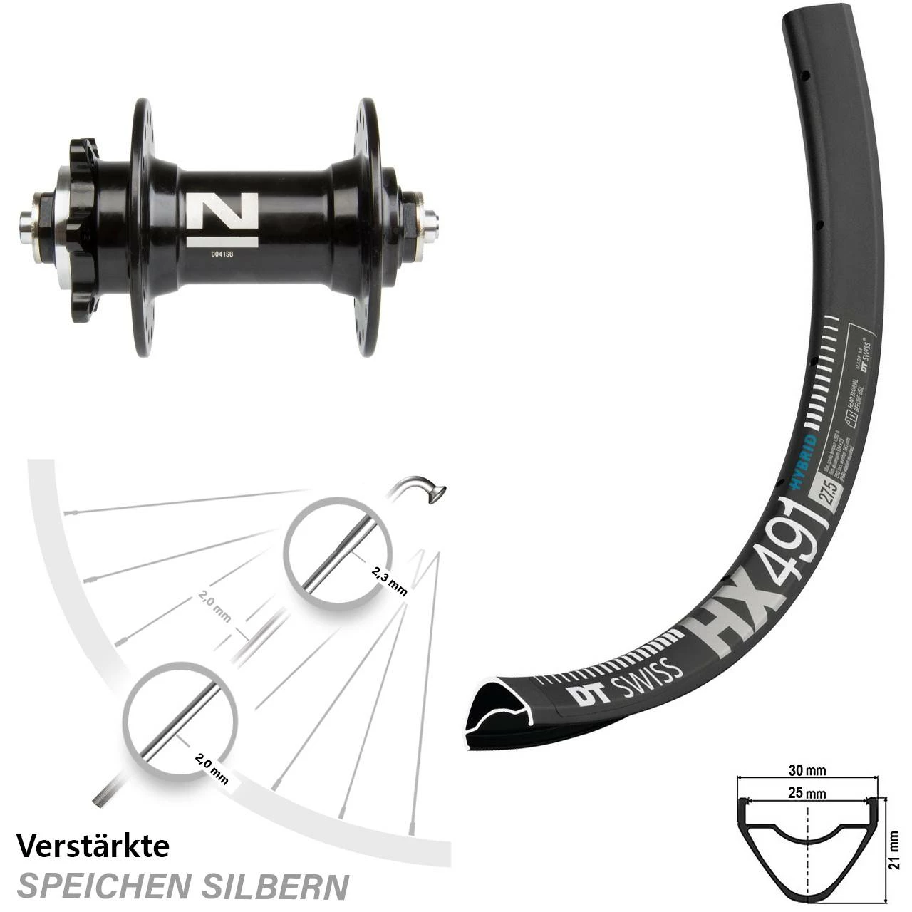Das 27,5 Zoll Zoll große Vorderrad verfügt über 100 mm Einbaubreite, eine ETRTO Größe von 25-584 mm und wird im E-Bike bis 25 km/h, E-MTB Bereich eingebaut. Sein maximal zulässiges Systemgewicht liegt bei bis zu 150 kg. Die integrierte schwarze DT Swiss HX 491 DB Disc schwarz Felge verfügt über eine Ventillochbohrung von 6,5 mm. Die schwarze Novatec D041SB schwarz Nabe unterstützt den robusten Ausbau des Vorderrads. Somit sind Sie auf ebenen, aber auch auf unbefestigten,unasphaltierten Untergründen im Gelände ideal aufgestellt. Es ist ausschließlich auf Fahrräder mit 6-Loch Scheibenbremsen ausgelegt und kann in unserem Onlineshop mit 36 silbernen Speichen bestellt werden, um Ihr Rad optimal für den E-Bike bis 25 km/h, E-MTB Bereich auszubauen!
