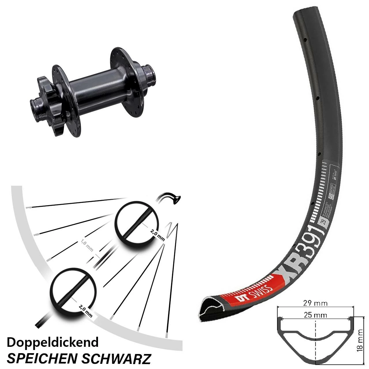 Technische Daten Vorderrad DT Swiss XR 391 Disc schwarz mit Nabe Aivee MP2 Boost 6-Loch vorne