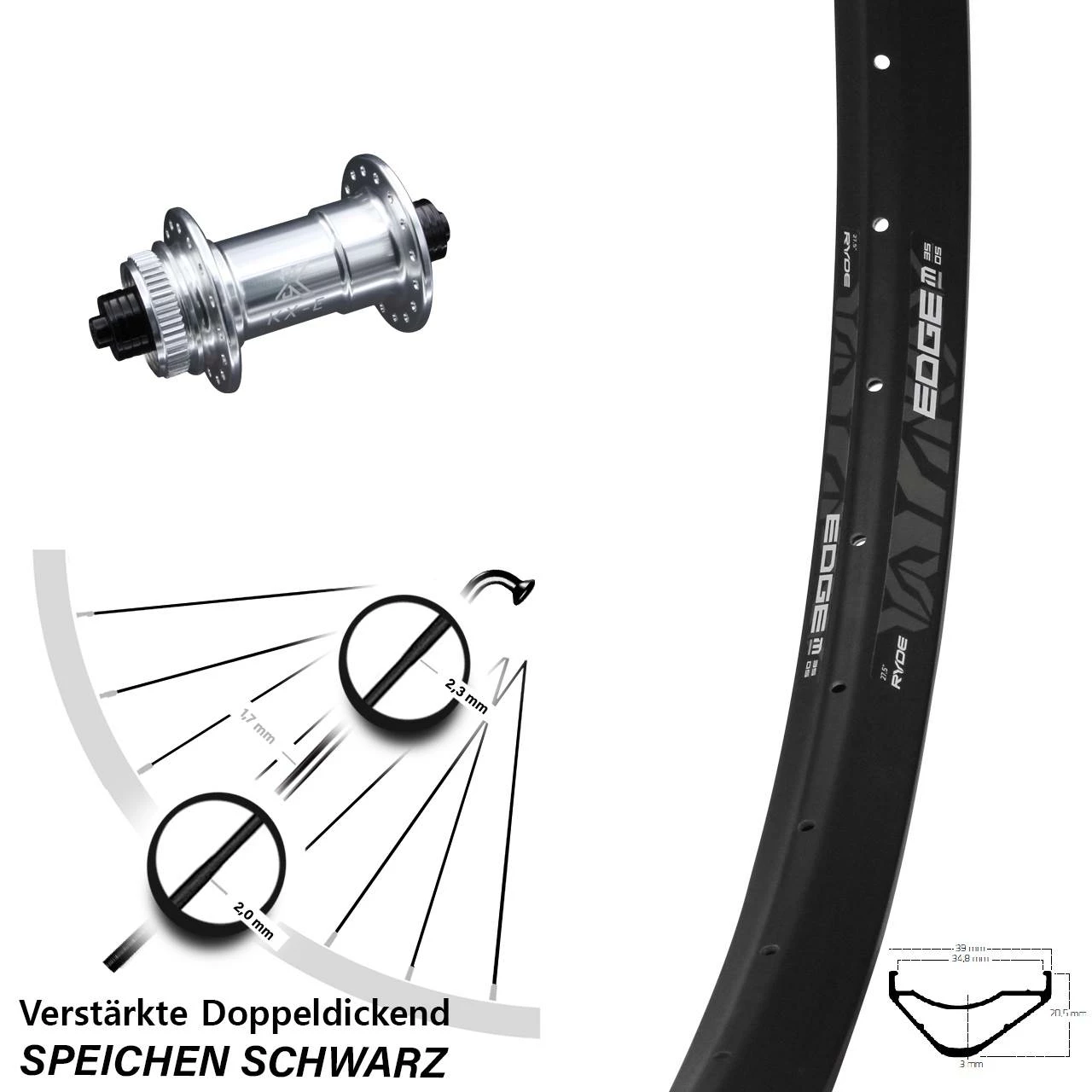 Technische Daten Vorderrad Ryde Edge M35 OS Disc schwarz mit Nabe KX-E Vorderradnabe Centerlock 5/100 silbern