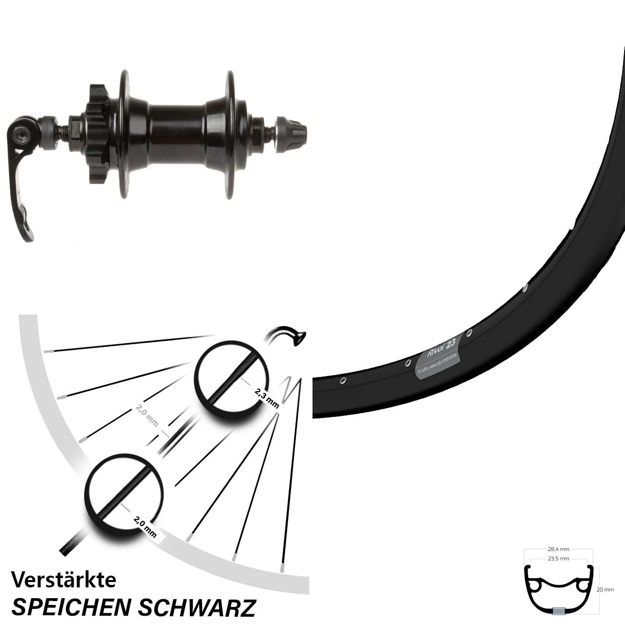 - 32 schwarze Sapim Speichen mit Speichenstärke 2,34/2,0 mm Edelstahl verstärkt – besonders stabile und verstärkte Dickendspeiche mit 2,34 mm Durchmesser im kritischen Bereich der Nabe